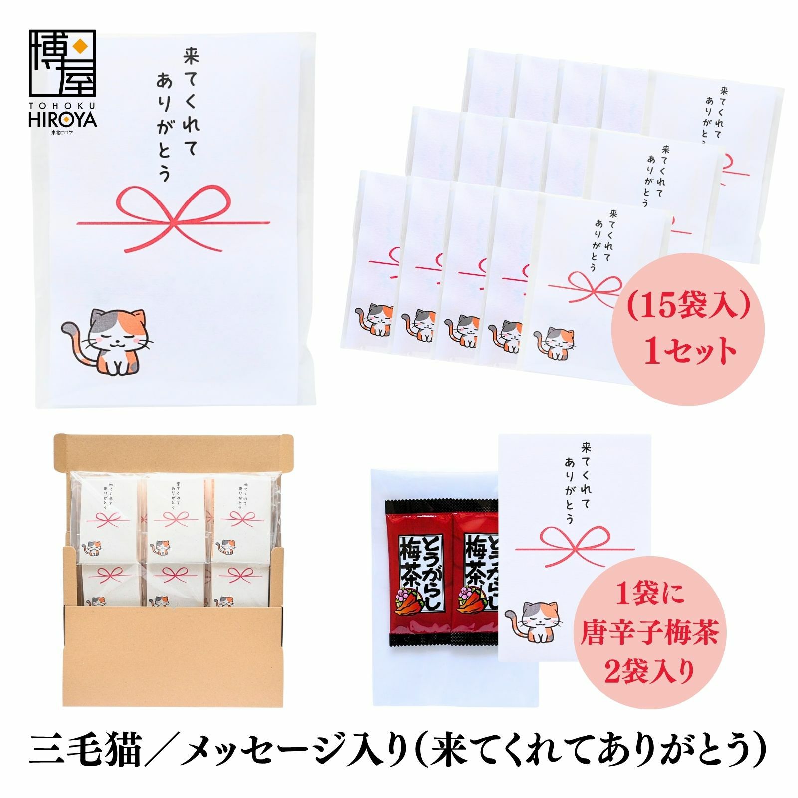 プチギフト お菓子 退職 お礼 女性 個包装 人気 お世話になりました プレゼント ありがとうお返し プチ おしゃれ ほんの気持ちです 異動 感謝の気持ち 感謝 送別会 おせわになりました 博屋 大量 退職 お礼 個包装 お返し 三毛猫 プチギフト「来てくれてありがとう」 (ほし梅3包入 梅塩飴5個入 玉ねぎスープ2包入 とうがらし梅茶2本入 しいたけ茶3本入)各 15袋 x 1セット~ 挨拶回り 粗品