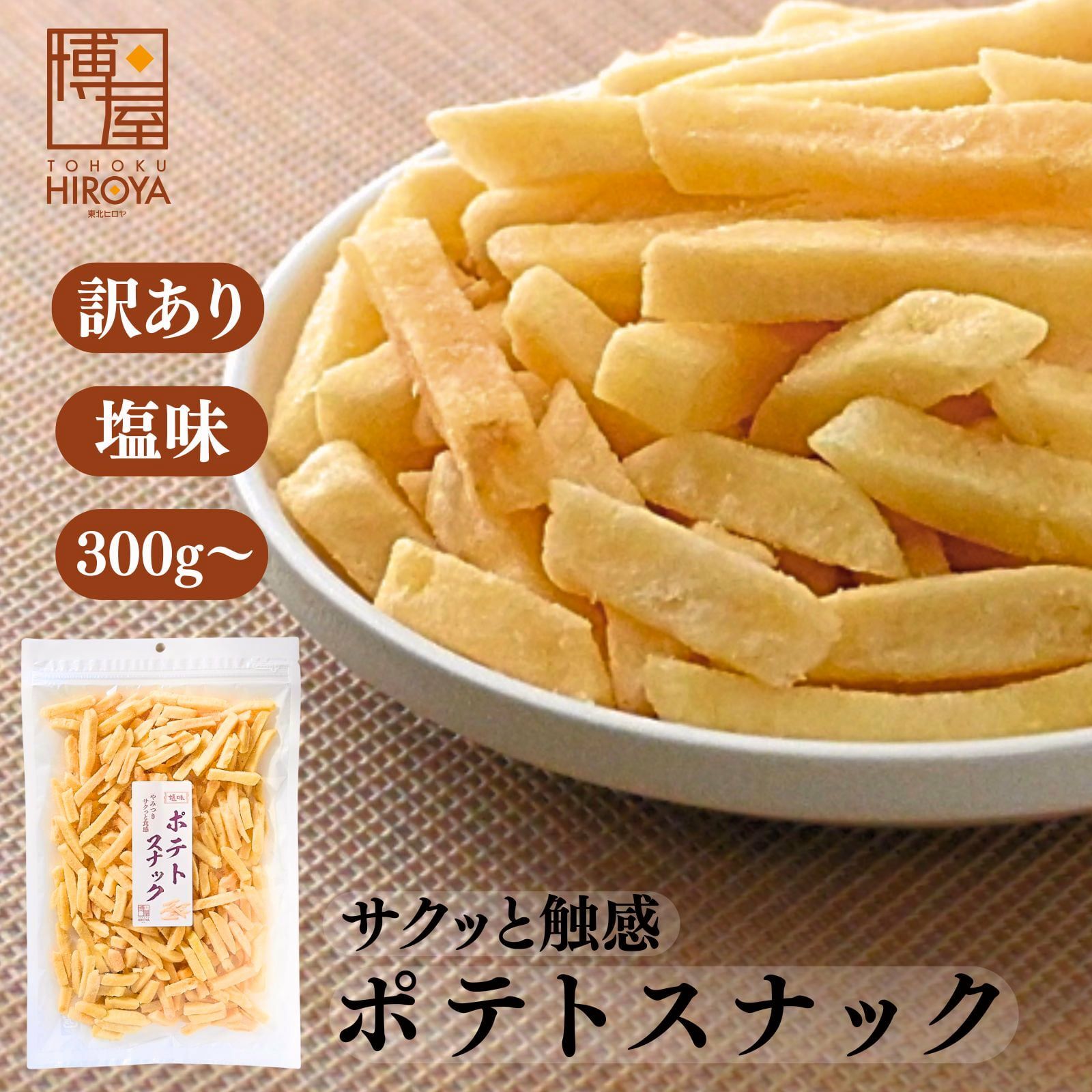 スティック状にカットしたポテトをバキュームフライ加工し、さっぱり塩味に味付けしております。そのままお召し上がり頂けます。