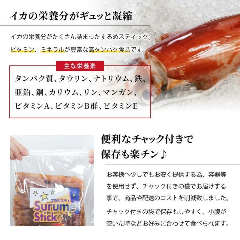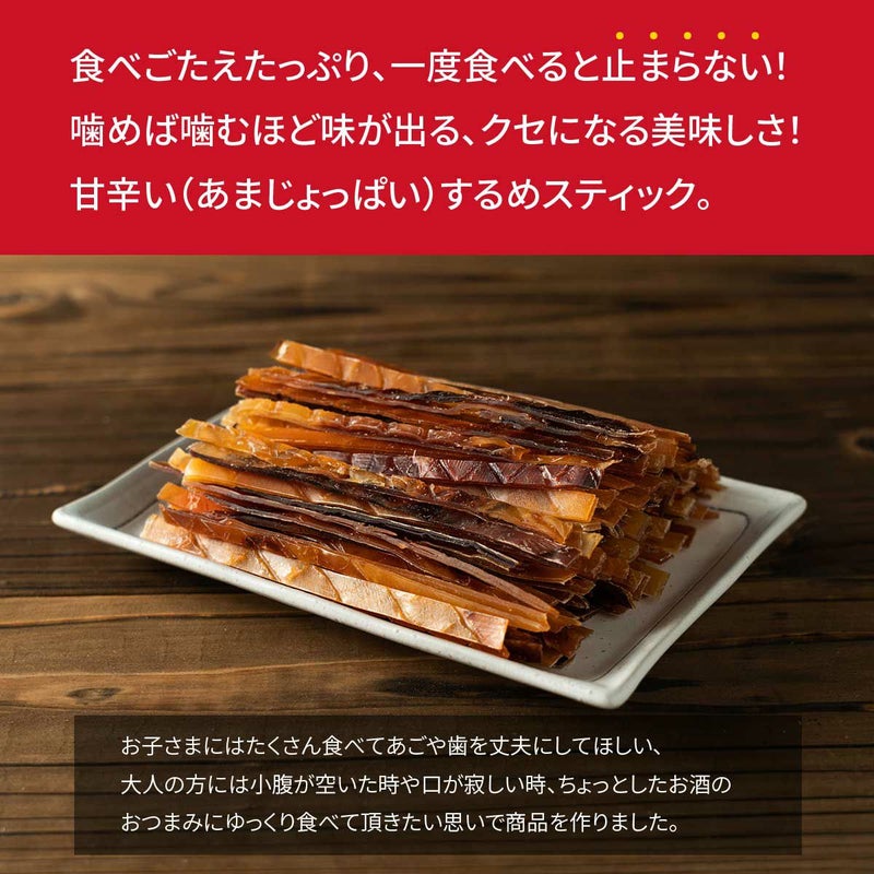 たいけど噛めば噛むほど味が出る、 美味しいするめスティックです。 業務用、するめスティックポットの詰替え用にご利用いただけます。 するめスティック スルメジャーキー 500g~