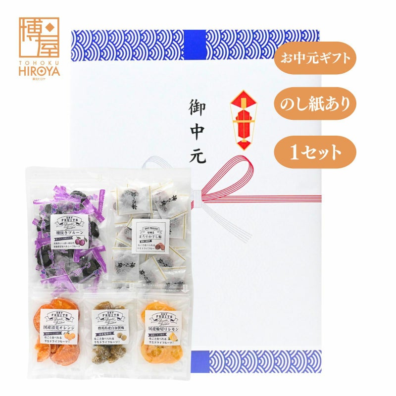 プルーン、まろやか干し梅、 国産清見オレンジ、国産輪切りレモン、群馬県産白加賀梅のこだわりドライフルーツセット。 保存袋は持ち運びに便利なチャック付きです。 ギフト セット ドライフルーツ 5種 (お中元) x 1セット~