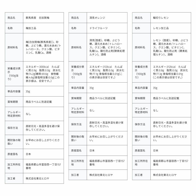 国産清見オレンジ、国産輪切りレモン、群馬県産白加賀梅です。