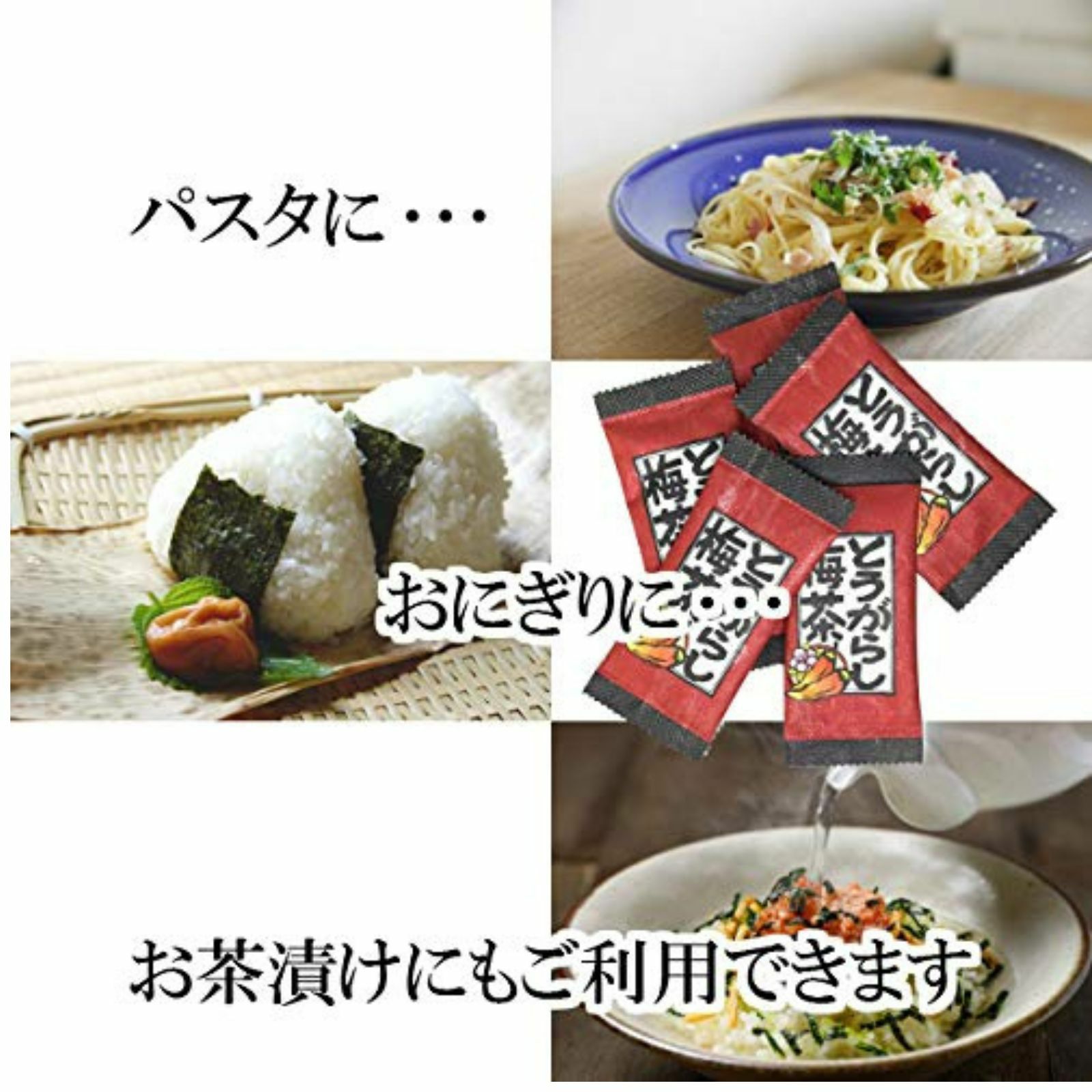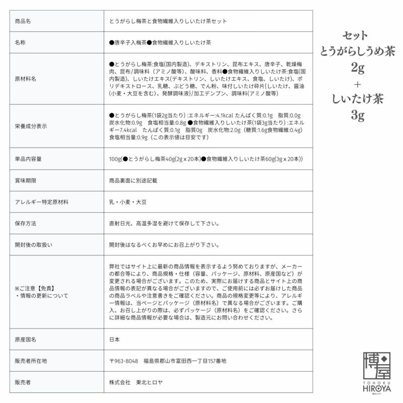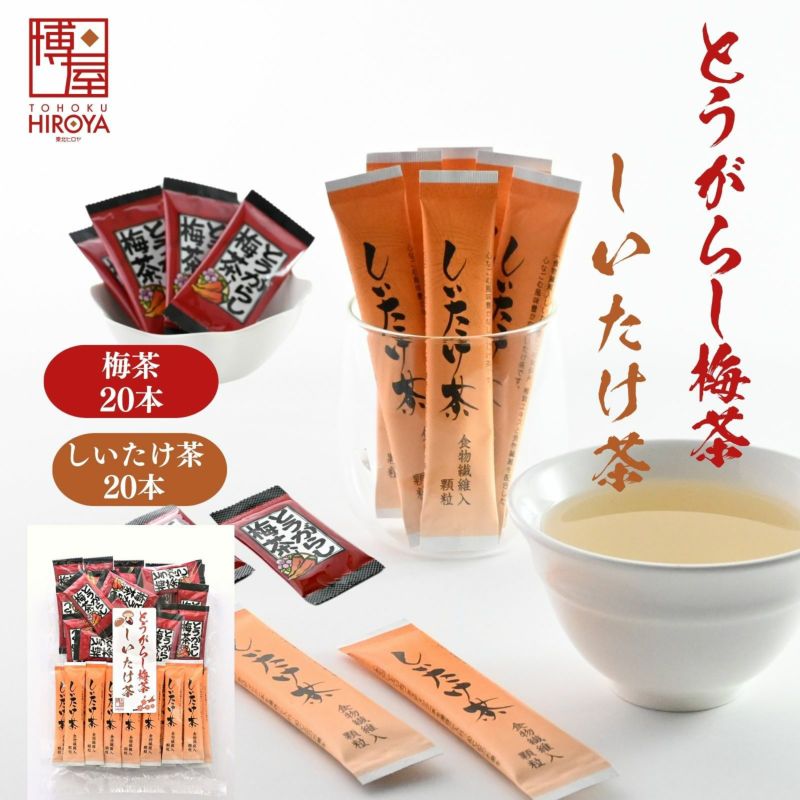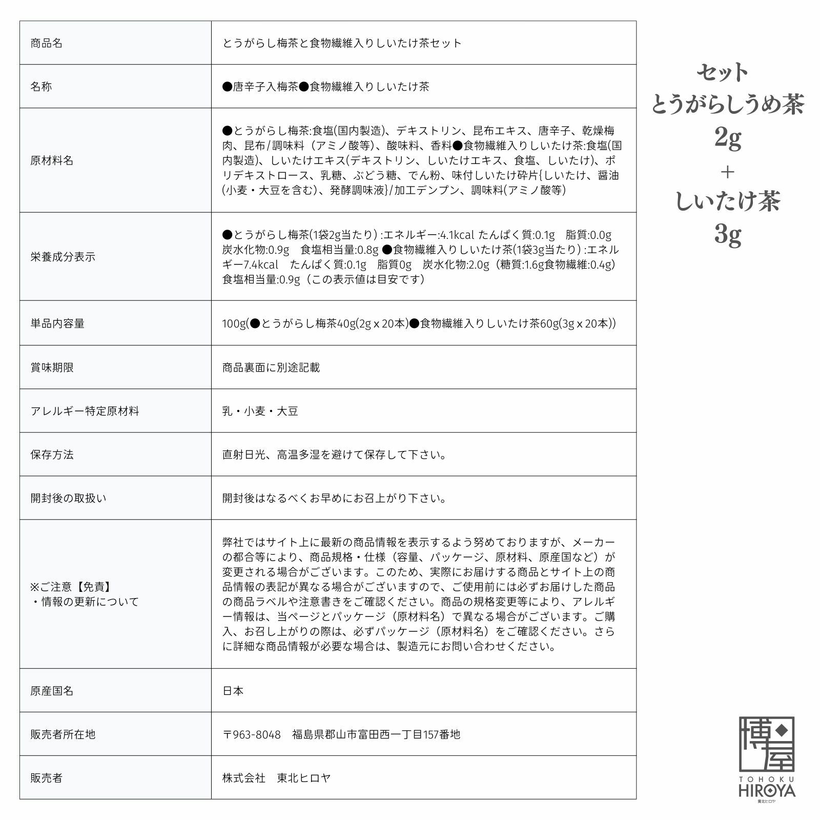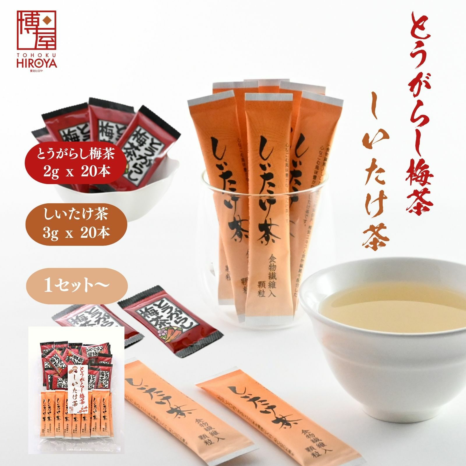 常温で保存可能、手軽に持ち運びしやすいようチャック袋に詰めた、当社で大人気のとうがらしうめ茶としいたけ茶をセットにしました。 料理への応用で、とうがらしうめ茶はパスタ、お茶漬け、浅漬け等に、しいたけ茶は茶碗蒸しやお吸い物等の和食はもちろんパスタ等に、様々な隠し味として使用する事ができます。