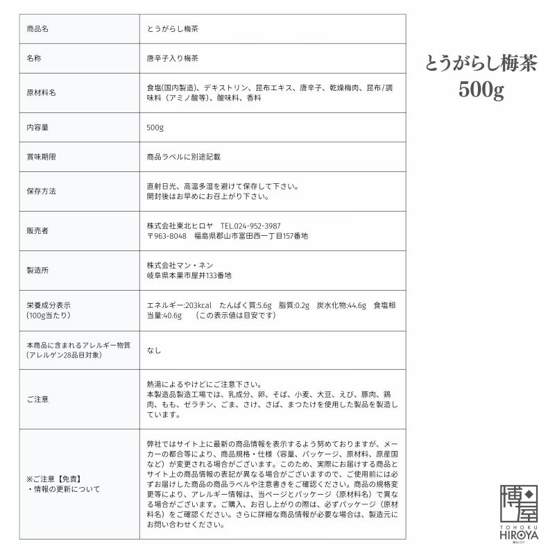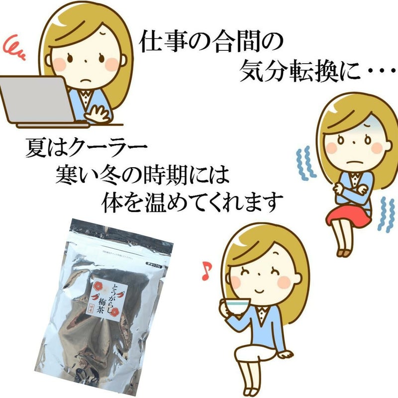 紀州梅肉と北海道真昆布が、ぴりりと辛い刺激的なとうがらしと美味しく出会いました。 パスタ、お茶漬け、おにぎり、お漬物など様々な料理にご利用いただけます。 多くの人に愛され続け、高評価頂いてる(株)マン・ネンの『とうがらしうめ茶』を、お料理にも好きなだけお使い頂けるよう、弊社オリジナルのお徳用規格で販売致しております。 チャック付きの袋で保存にも便利です。