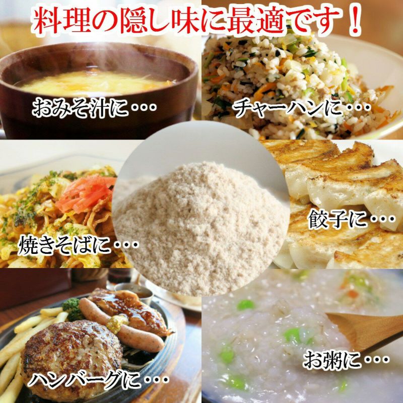 国産、長崎県島原産の新鮮な椎茸を粉末にした、 無農薬、調味料・保存料無添加の「しいたけ粉」「しいたけパウダー」「乾燥椎茸粉末」です。 お鍋に入れるだけで旨味が濃くなり、香りも良くなります。 また餃子の具やハンバーグの具など色々なお料理に混ぜ込めば、 しいたけの旨みがギュッと凝縮された、きのこがふわっと香る美味しい料理の出来上がりです。 ※お召し上がりの際は、加熱してお召し上がりください。