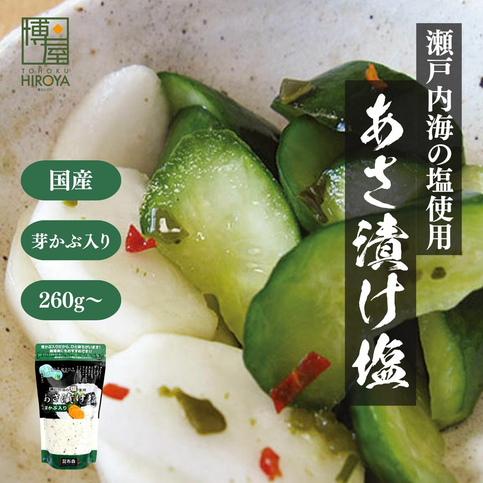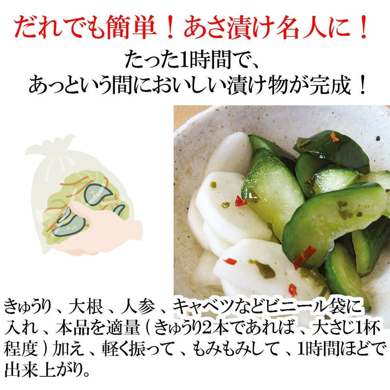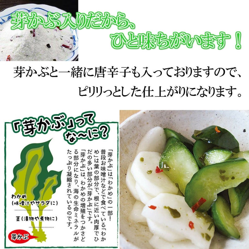 誰でも簡単!あさ漬け名人! たった1時間で、あっという間に美味しい漬け物が完成! 手軽にぱっと漬けることが出来て、とってもおいしい「浅漬け用の焼き塩」です。 瀬戸内海の塩使用。芽かぶ入りだからひと味ちがいます。 芽かぶと一緒に唐辛子も入っておりますので、ピリリとした仕上がりになります。 保存に便利なチャック袋入り!調理塩にもおすすめです。