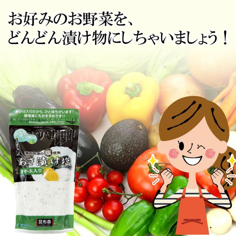 誰でも簡単!あさ漬け名人! たった1時間で、あっという間に美味しい漬け物が完成! 手軽にぱっと漬けることが出来て、とってもおいしい「浅漬け用の焼き塩」です。 瀬戸内海の塩使用。芽かぶ入りだからひと味ちがいます。 芽かぶと一緒に唐辛子も入っておりますので、ピリリとした仕上がりになります。 保存に便利なチャック袋入り!調理塩にもおすすめです。