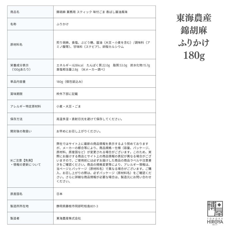 スティックタイプで持ち運びに便利な「にしきごま」は、香ばしい醤油風味が特徴の味付け胡麻です。ご飯やおにぎりはもちろん、サラダやラーメンなど、さまざまな料理に手軽にプラスできます。
