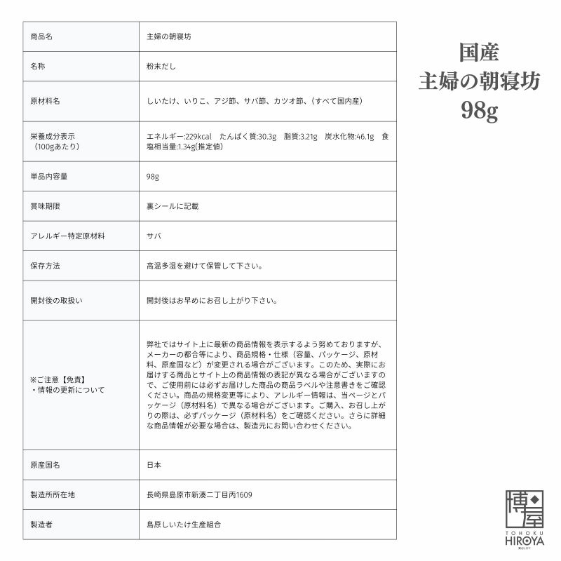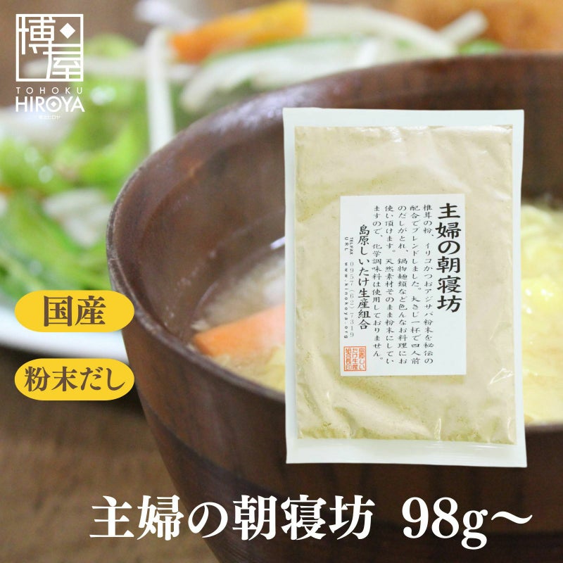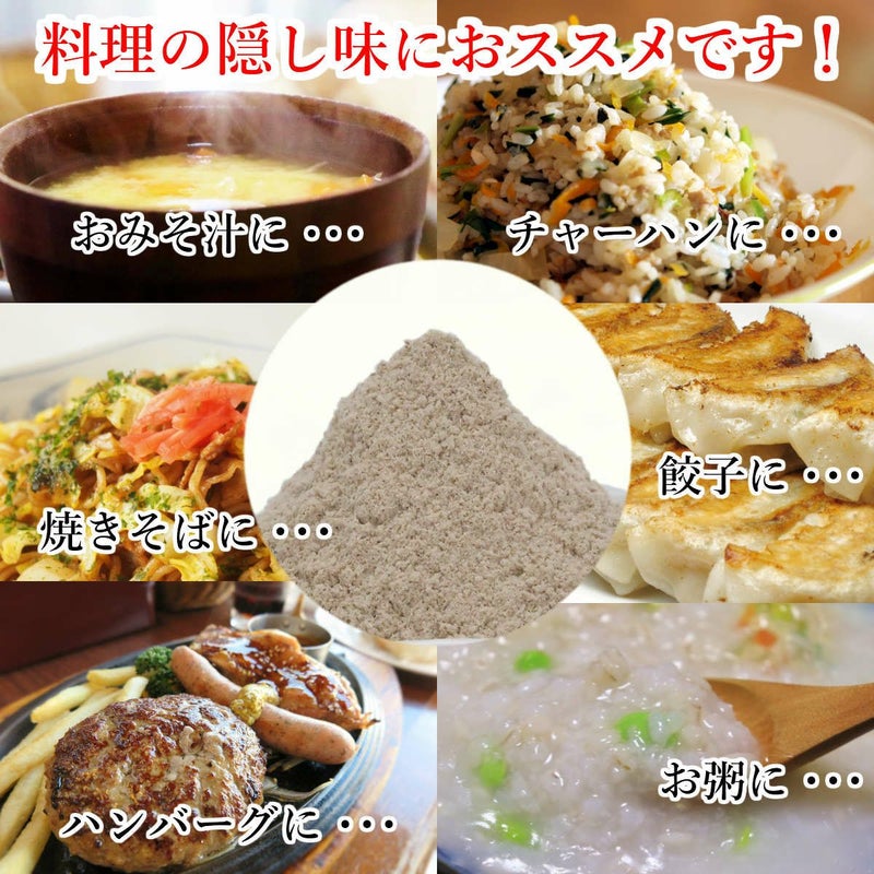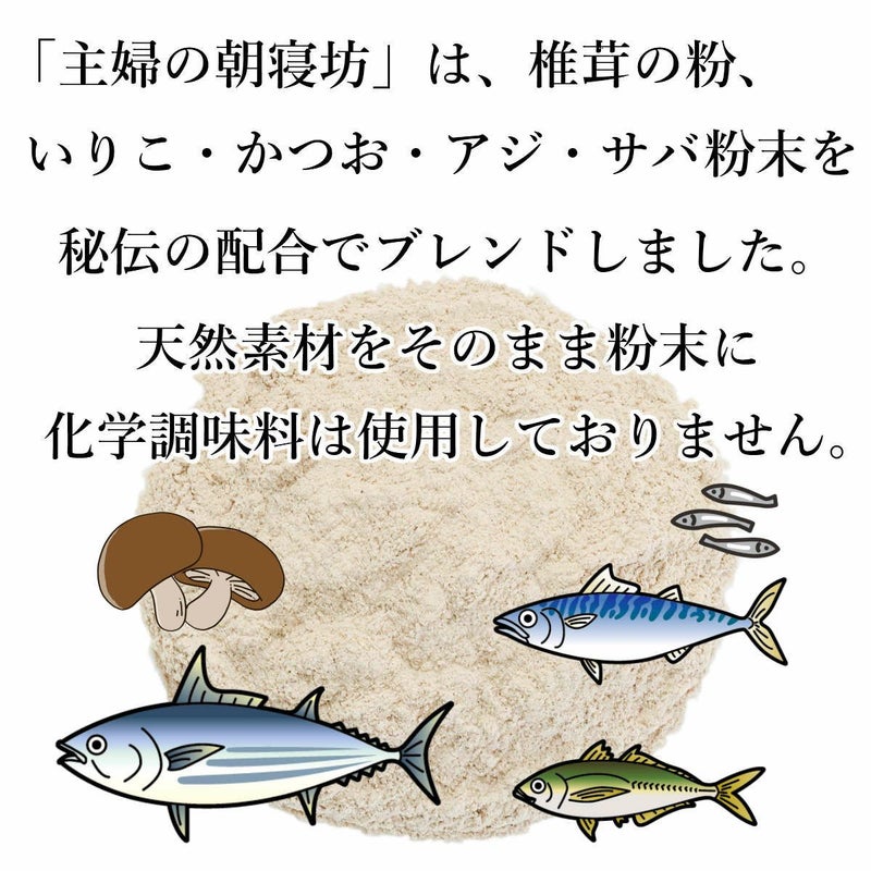 国産の椎茸の粉、いりこ・かつお・アジ・サバの粉末を秘伝の配合でブレンドしました。 大さじ一杯で四人前のだしがとれ、鍋物麺類など色々なお料理にお使い頂けます。 天然素材をそのまま粉末にしており、化学調味料は使用しておりません。