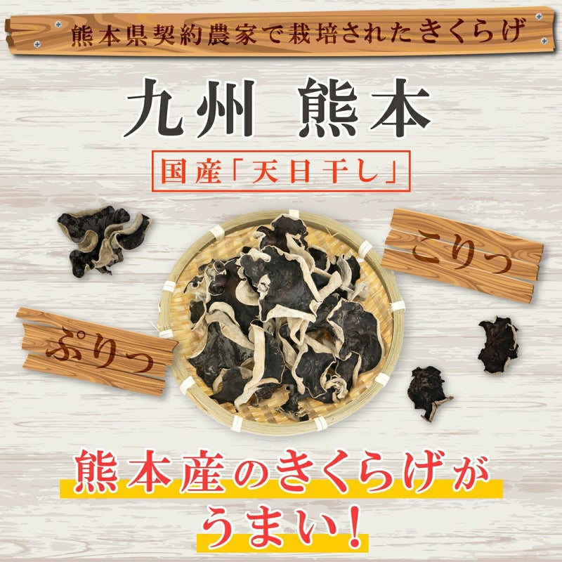 現在国内で流通する「きくらげ」のほとんどが中国産ですが、 この「きくらげ」は国産、熊本県産です。 契約農家で作られた熊本県産の「きくらげ」はツヤもよく、 肉厚で歯ごたえもあり、香りも芳醇です。 味染みが良いので、とてもおいしくお召し上がりいただけます。