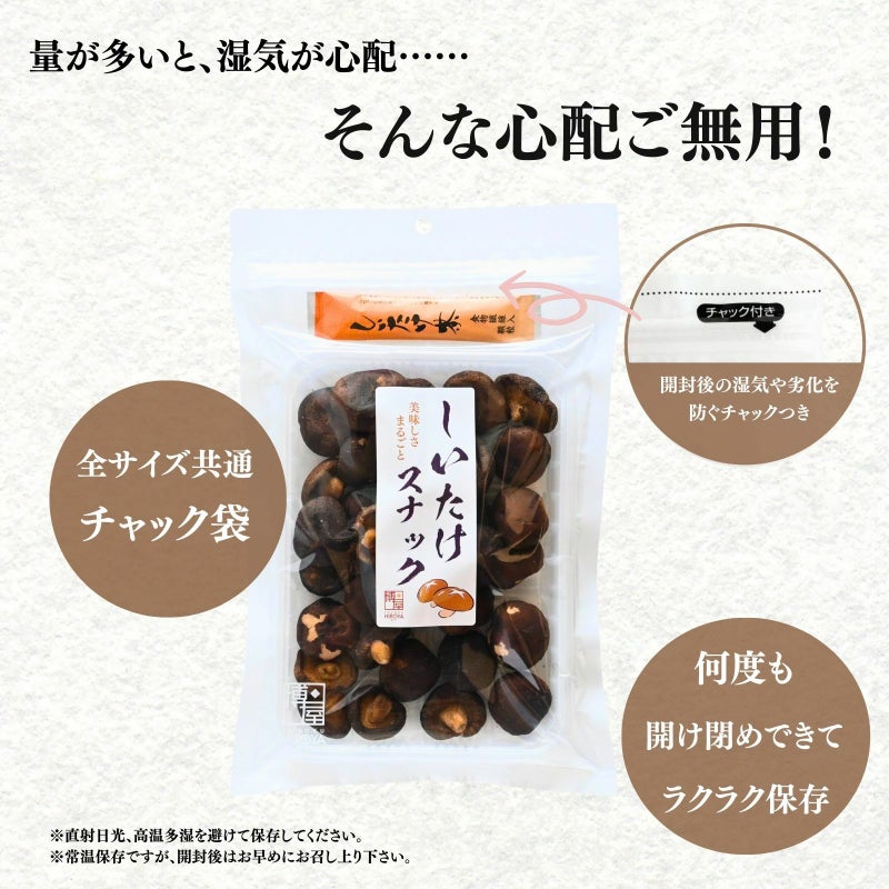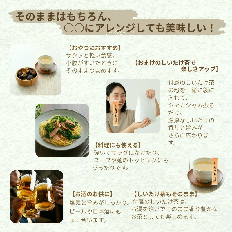 おやつやおつまみにはもちろん、サラダやスープのトッピングにもぴったり! 食物繊維やタンパク質を含み、食生活を気にする方にもぴったりです。 椎茸が苦手な方にも楽しめる味わいに仕上げました。ぜひ一度お試しください。