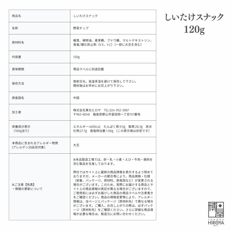 真空フライ製法で仕上げた、軽やかなサクサク食感がクセになる一品。 椎茸本来の美味しさと、ほどよい塩味が絶妙なバランス。 博屋 しいたけスナック 120g x1袋~