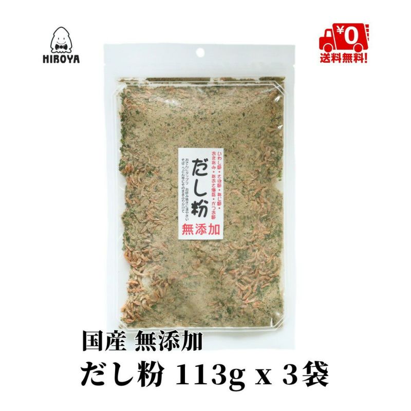海の栄養豊富!国産のいわし節・さば節・あじ節・オキアミ・青さのり・かつお節・塩のみを使用した無添加のだし粉です。 国産 無添加 だし粉 113g x 3袋