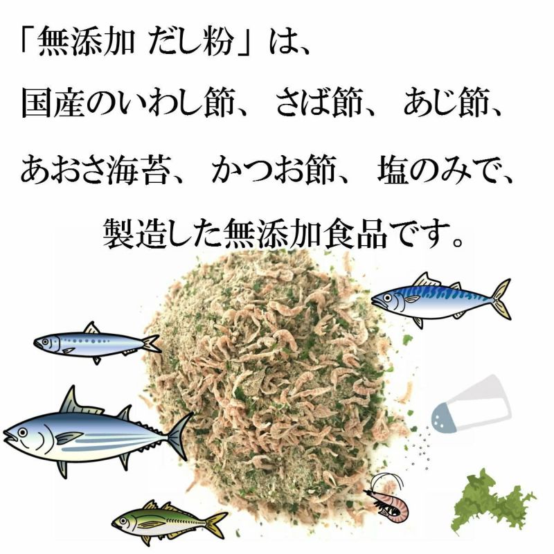 国産のいわし節・さば節・あじ節・オキアミ・青さのり・かつお節・塩のみを使用した無添加のだし粉です。