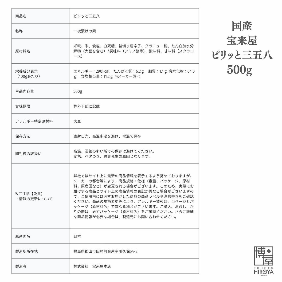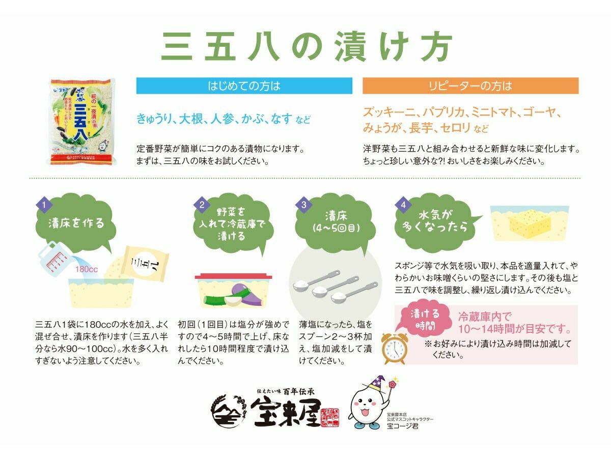 東北地方に伝わる糀を生かした漬け床です。お水とお好みの野菜を入れて一晩漬けるだけで三五八漬けが完成します。 国産 宝来屋 三五八 (500g x 20袋)x1箱 国産 送料無料 ¥ 8,998 税込 カートに入れる お気に入り登録