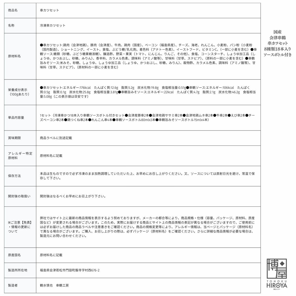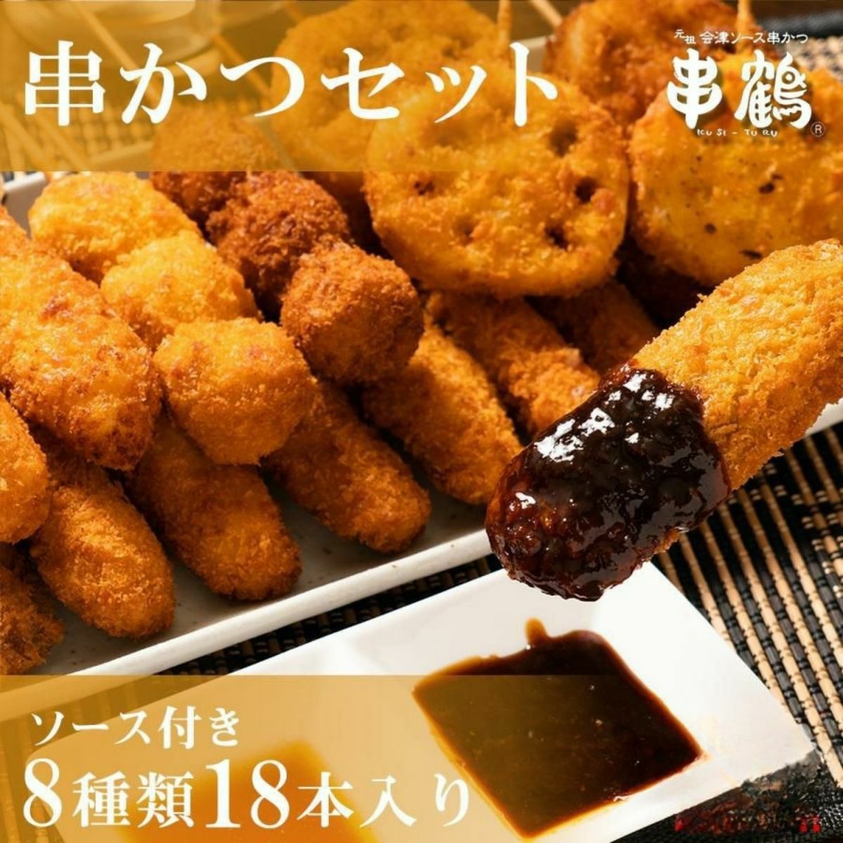 会津<串鶴>の味をご家庭で!揚げるだけで簡単にお召しあがりいただける串かつセットです。「串鶴ソース」も合わせてお届けします。 国産 会津串鶴 串カツセット (8種類 18本入り ソースボトル付き) x 1箱 国産 送料無料 ¥ 5,798 税込 カートに入れる お気に入り登録