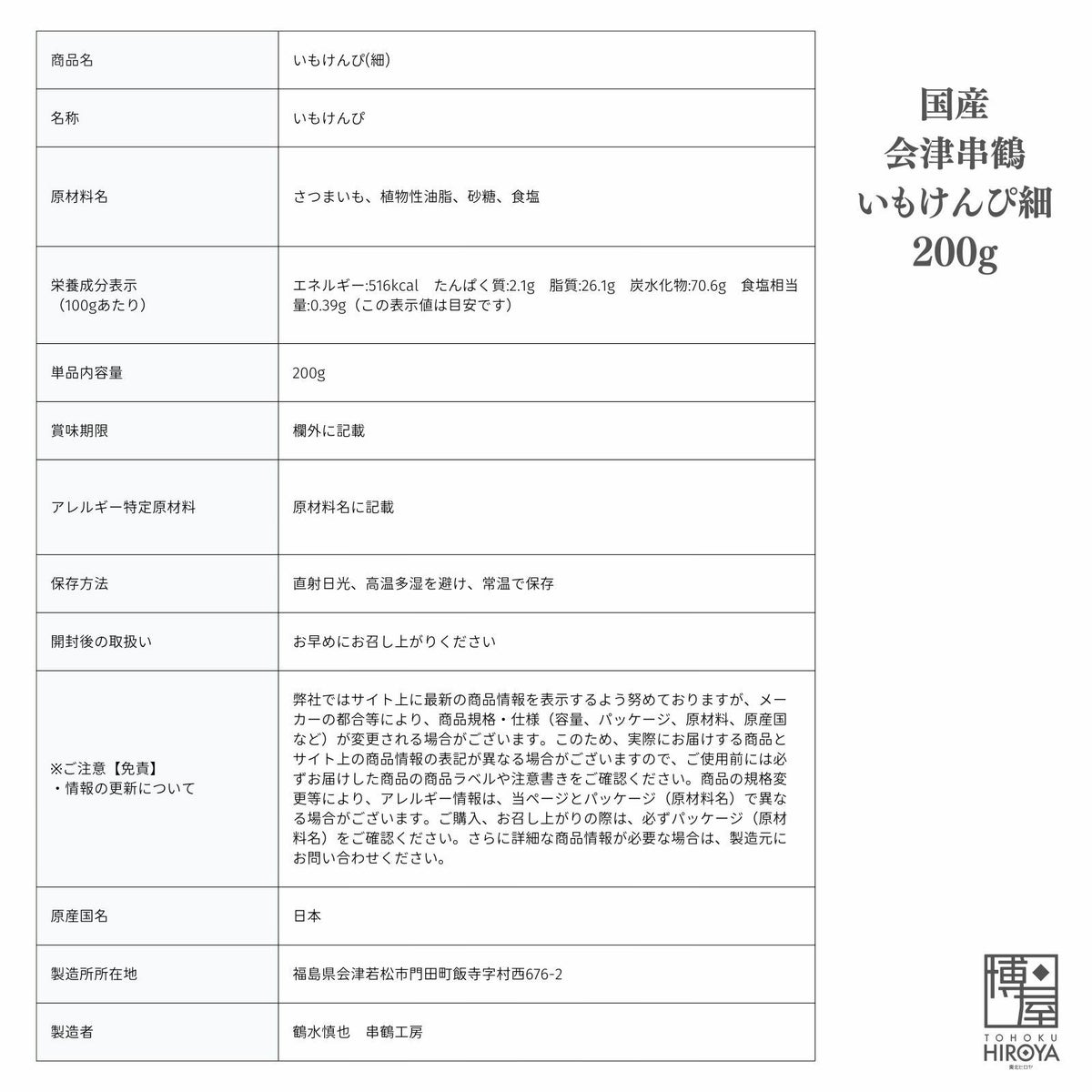 さつまいものほんのりとした甘さが丸みのある「会津山塩」の塩味で引き立ち、つい手が止まらない後引く美味しさです。 国産 会津串鶴 いもけんぴ 細 (200g x 3個) x 1袋 国産 送料無料 チャック付き保存袋 ¥ 4,598 税込 カートに入れる お気に入り登録