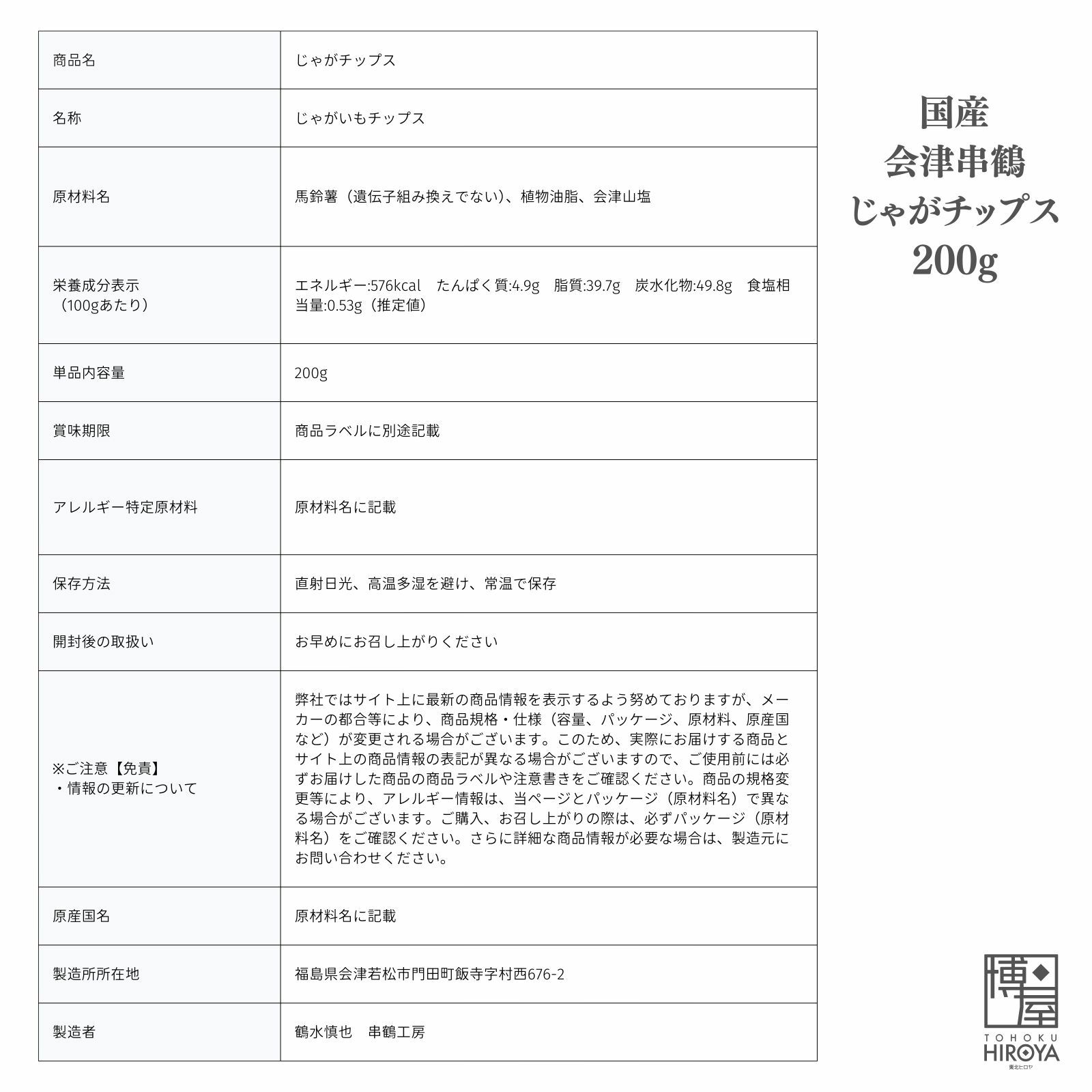 会津磐梯山の麓【大塩温泉】の源泉を煮詰めて造った「会津山塩」のみで味付け。塩分控えめで素材の味が楽しめます。 国産 会津串鶴 じゃがチップス (200g x3個) x 1袋 国産 送料無料 チャック付き保存袋 ¥ 5,998 税込 カートに入れる お気に入り登録