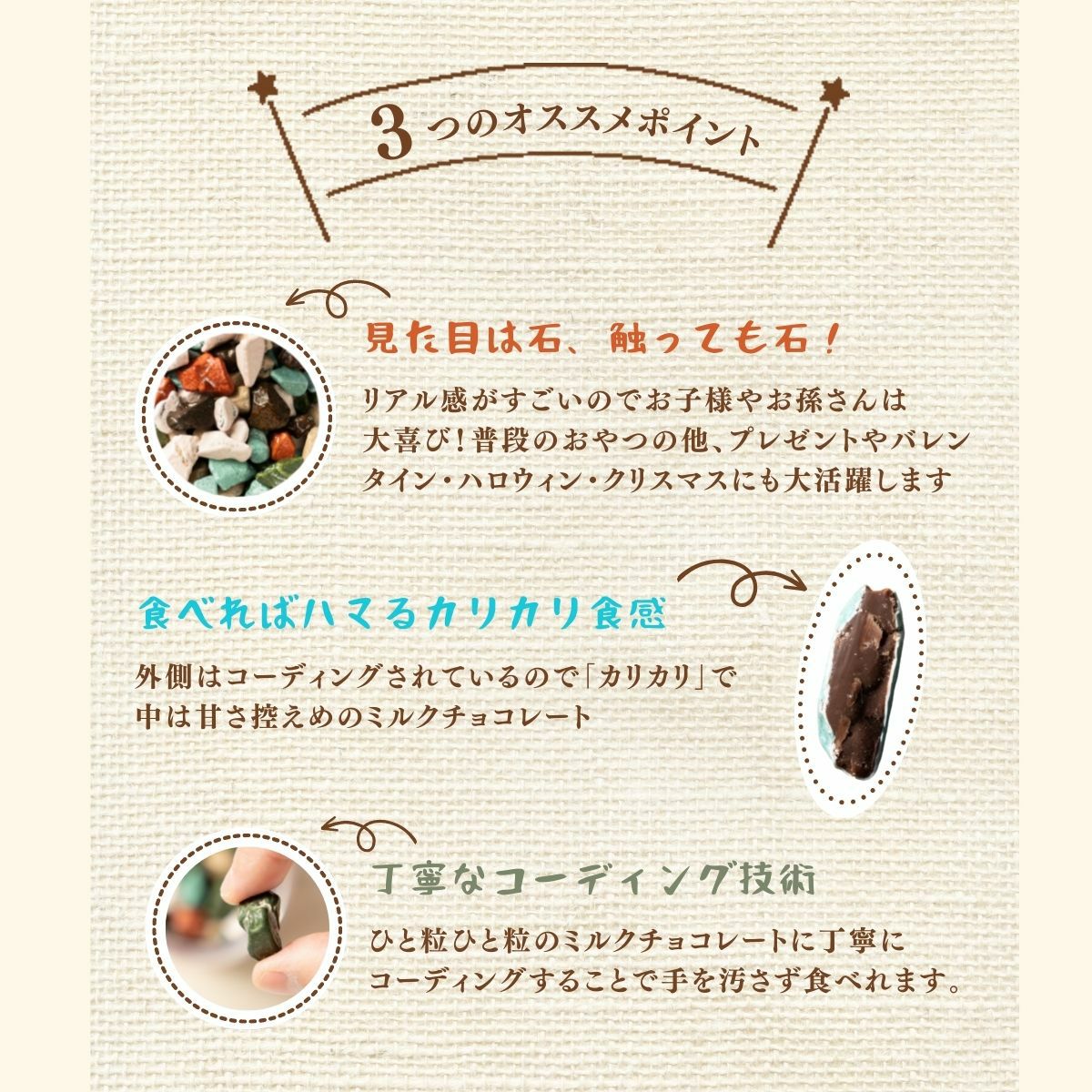 見た目は小石そっくり!?そのまま食べて美味しいミルクチョコレート味。お菓子作りの飾りつけなどにも適しています。 【通常】石っころ チョコ レート 400g x 1袋~ 送料無料 チャック付き保存袋 ¥ 1,468 税込 〜 ¥ 税込 在庫切れ 詳細を見る お気に入り登録