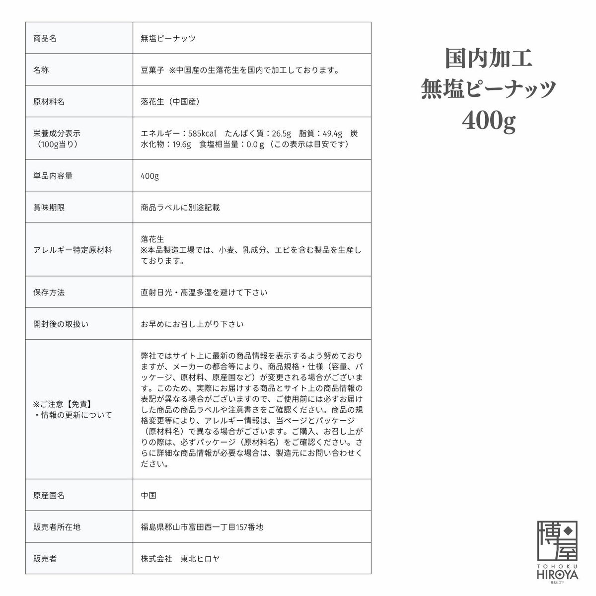 渋皮付きの美味しい無塩・無添加ピーナッツ。厳選された生落花生を国内で素焼き加工しました。調味料や添加物を使用していないので、自然なピーナッツの風味が味わえます。 国内加工 無塩 ピーナッツ 400g x 1袋~ 送料無料 チャック付き保存袋 ¥ 1,098 税込 〜 ¥ 税込 詳細を見る お気に入り登録