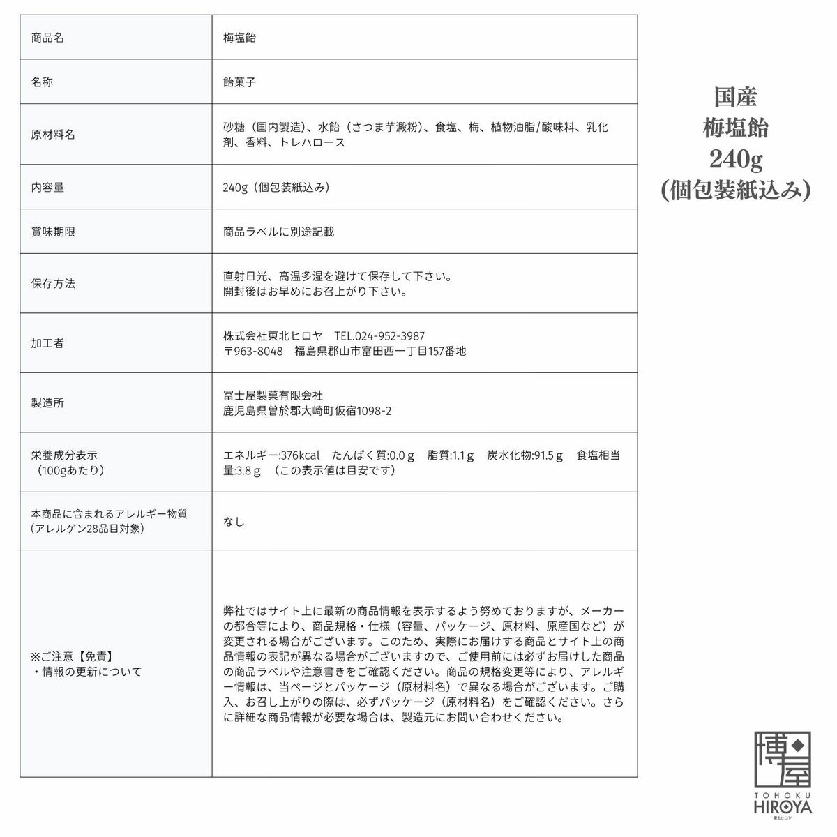 こしき島沖合いの海洋深層水から抽出した塩と、鹿児島県産の梅を使用した塩飴です。夏場の塩分補給や、熱中症対策にもおすすめです。 国産 梅 塩飴 240g x 1袋~ 国産 送料無料 チャック付き保存袋 ¥ 998 税込 〜 ¥ 税込 詳細を見る お気に入り登録