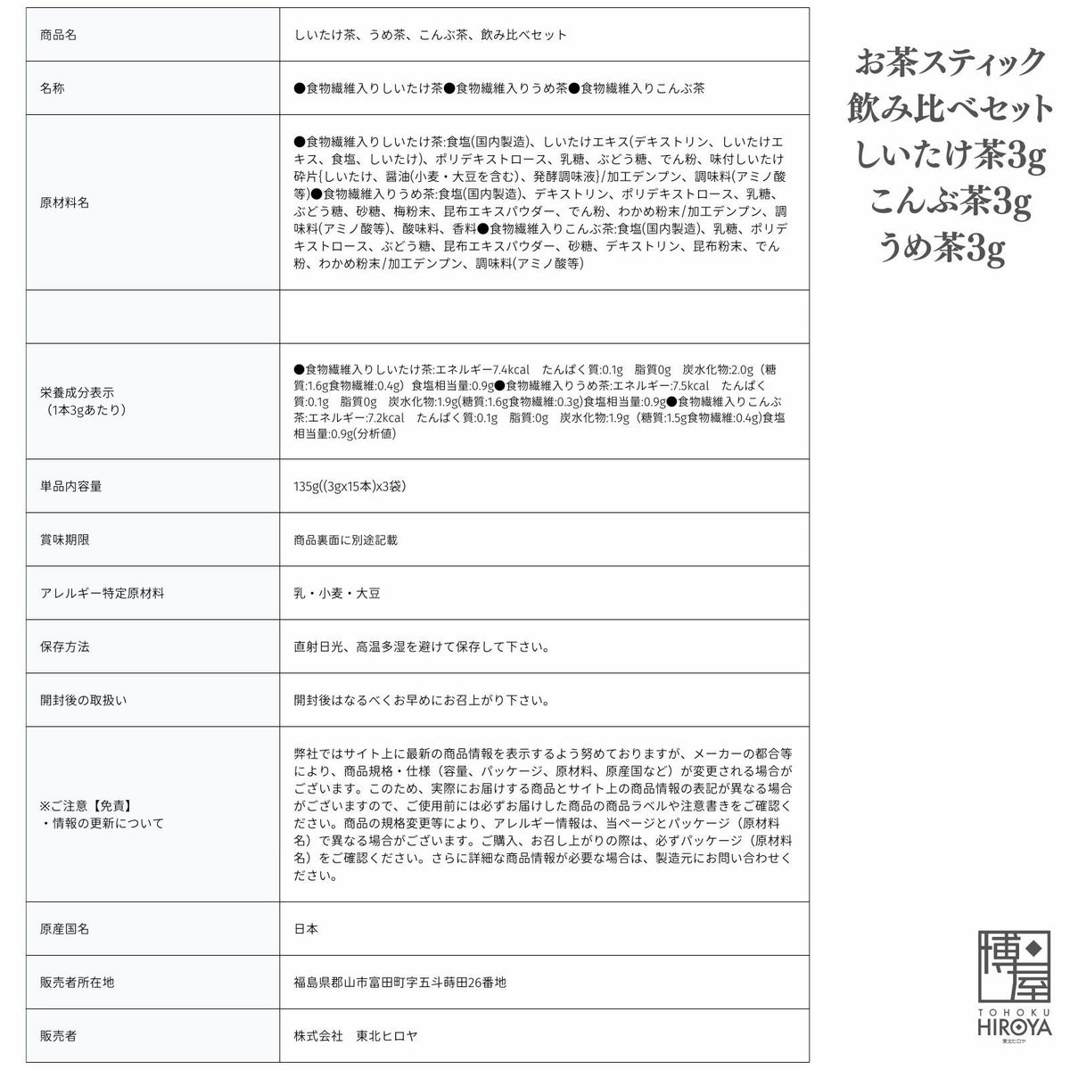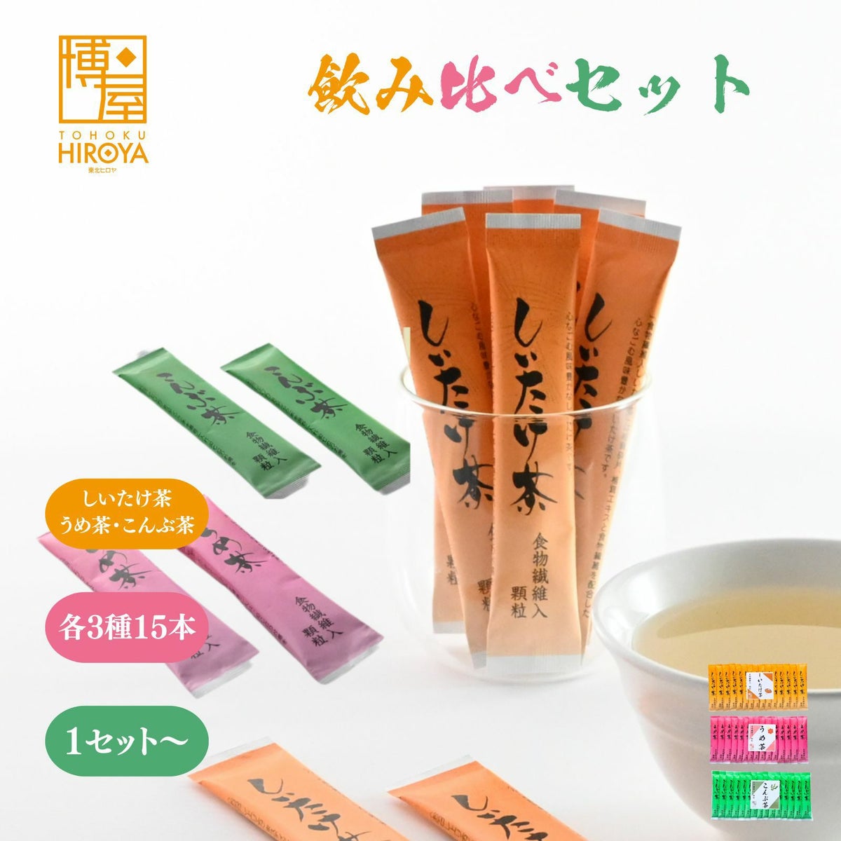 ノンカフェインでシンプルな味わい。大容量でお茶漬けやお料理の下味、隠し味にと幅広くお使いいただけます。 かね七 お茶 スティック 飲み比べ セット(しいたけ茶 3g x 15本 + こんぶ茶 3g x 15本 + うめ茶 3g x 15本) x 1セット~ 国産 送料無料 ¥ 1,198 税込 〜 ¥ 税込 詳細を見る お気に入り登録