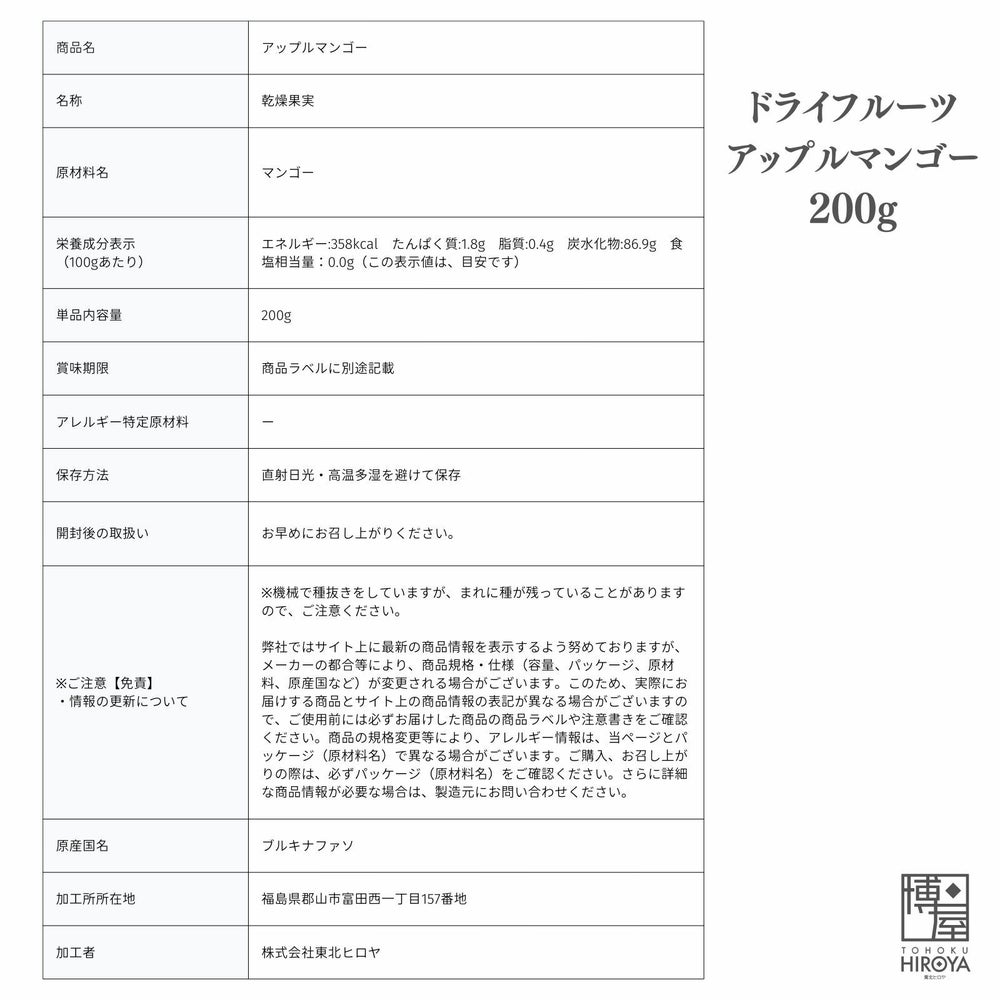 ブルキナファソ産無農薬栽培のアップルマンゴーを使用し、砂糖・香料・着色料不使用で、安心してお楽しみいただけます。ヨーグルトと合わせたり、スイーツの材料にも◎ ドライフルーツ アップルマンゴー 200g x 1袋~ 送料無料 チャック付き保存袋 ¥ 1,198 税込 〜 ¥ 税込 詳細を見る お気に入り登録