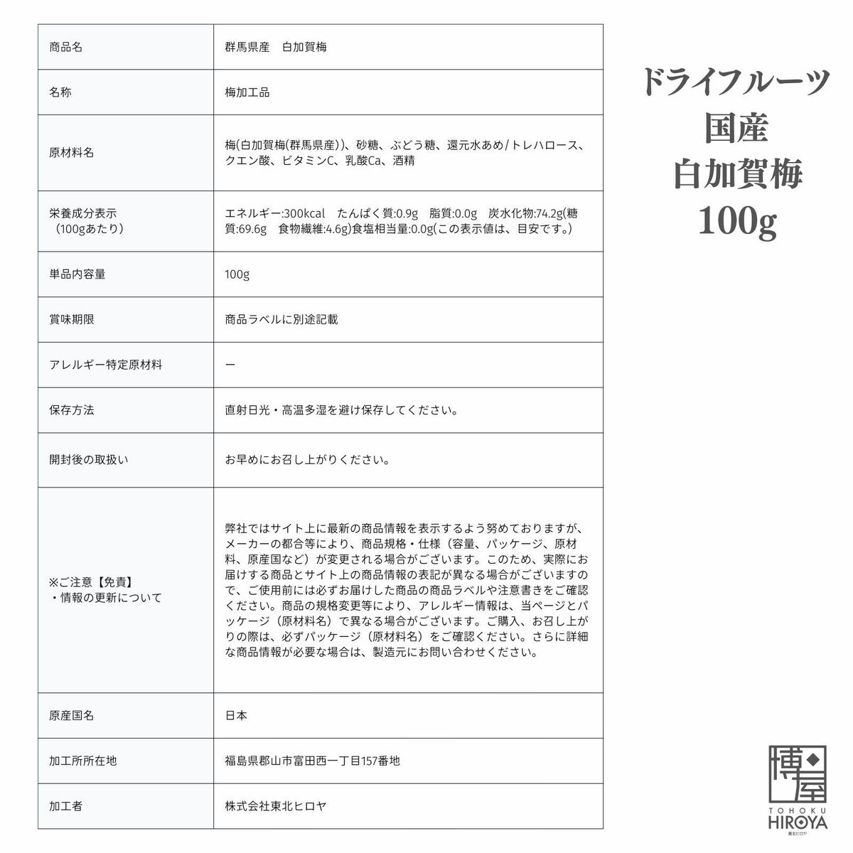 群馬県産の白加賀梅を使用し、香料・着色料無添加、合成保存料不使用で素材本来のおいしさをお楽しみいただけます。南信州菓子工房原料使用。種ぬきで食べやすいひとくちサイズです。 ドライフルーツ 国産 白加賀梅 100g x 1袋~ 国産 送料無料 チャック付き保存袋 ¥ 1,268 税込 〜 ¥ 税込 詳細を見る お気に入り登録