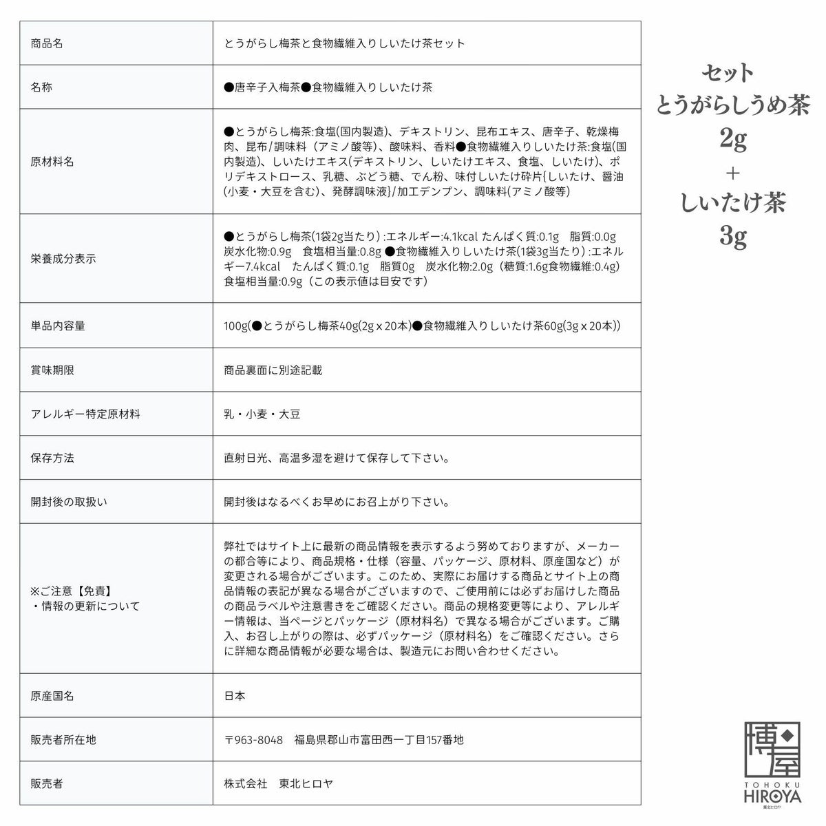 【カプサイシン効果】で体を温めてくれる「とうがらしうめ茶」と、ほっとする味わいの「しいたけ茶」の最強コンビです。 セット (とうがらし うめ茶 2g x 20包 +しいたけ茶 3g x 20包) x 1袋~ 国産 送料無料 ¥ 1,198 税込 〜 ¥ 税込 詳細を見る お気に入り登録