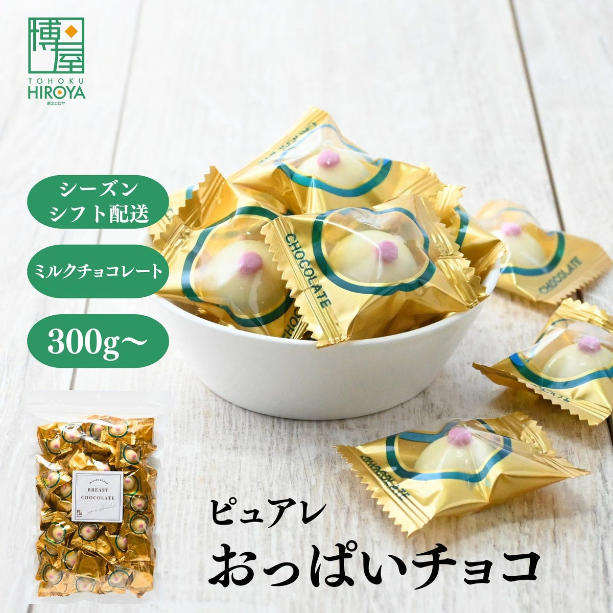 パロディーチョコレートですが、味はとてもいい感じのホワイトチョコレートです。プレゼントやパーティー等で人気があります。 【通常】ピュアレ おっぱいチョコ 300g x 1袋~ 国産 送料無料 チャック付き保存袋 ¥ 2,498 税込 〜 ¥ 税込 詳細を見る お気に入り登録