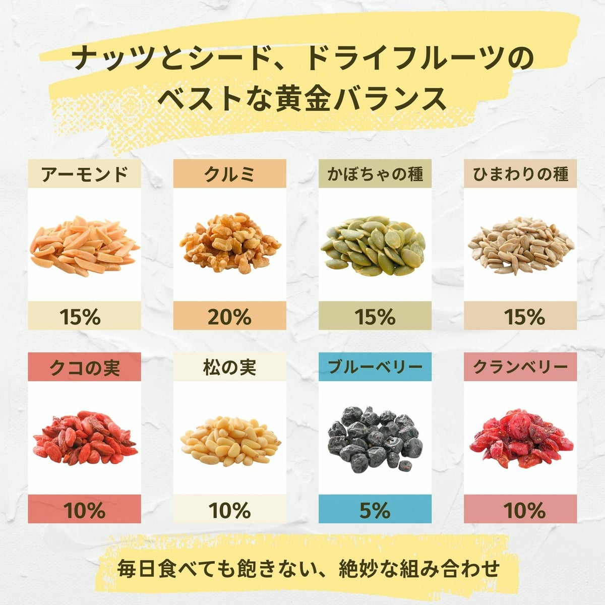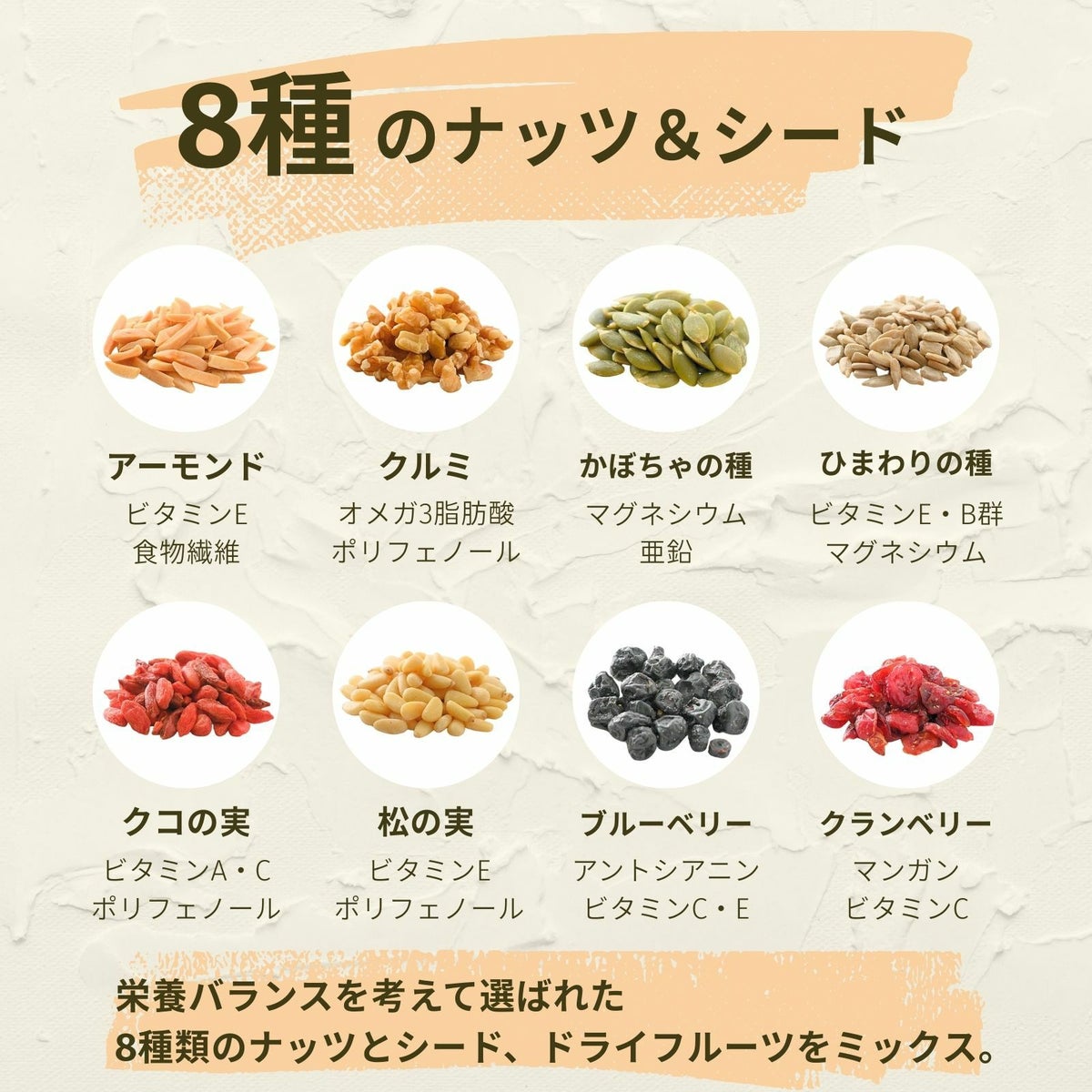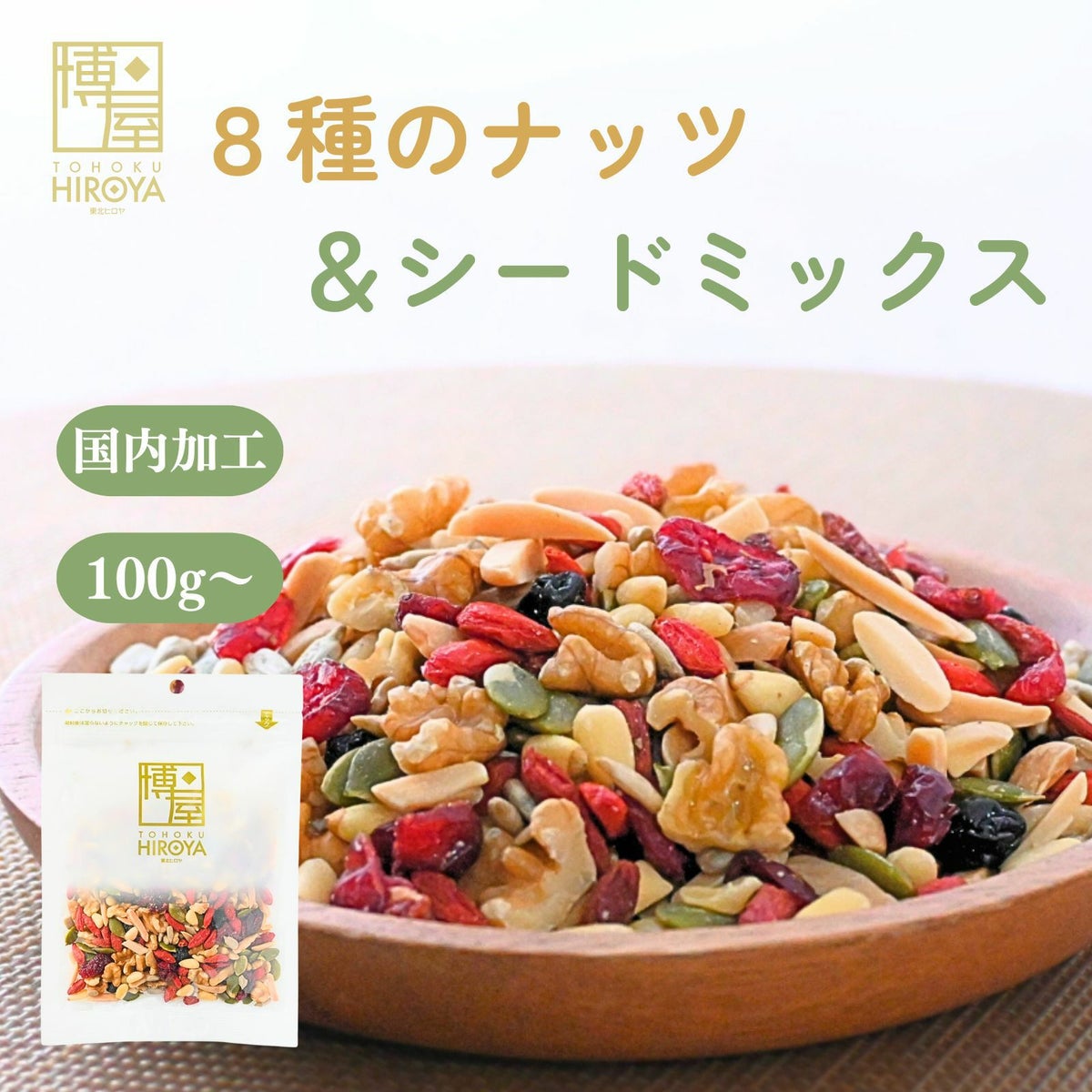くるみ、アーモンド、松の実、かぼちゃの種、ひまわりの種、クコの実、ブルーベリー、クランベリーをほどよく組み合わせ、素材本来の味・香り・食感を楽しめるバランスのとれたナッツ&ドライフルーツミックスです。 8種のナッツ&シードミックス 100g x 1袋~ 送料無料 チャック付き保存袋 ¥ 998 税込 〜 ¥ 税込 詳細を見る お気に入り登録
