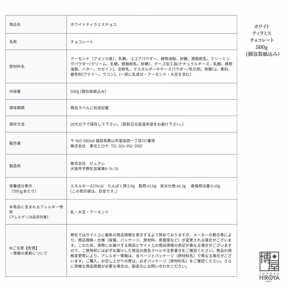 アーモンドをキャラメルコーティングし、マスカルポーネをふんだんに使ったクリームチーズで包んでココアパウダーで仕上げました。 【通常】ティラミス チョコレート ホワイト 500g x 1袋~ 国産 送料無料 チャック付き保存袋 ¥ 3,698 税込 〜 ¥ 税込 在庫切れ 詳細を見る お気に入り登録