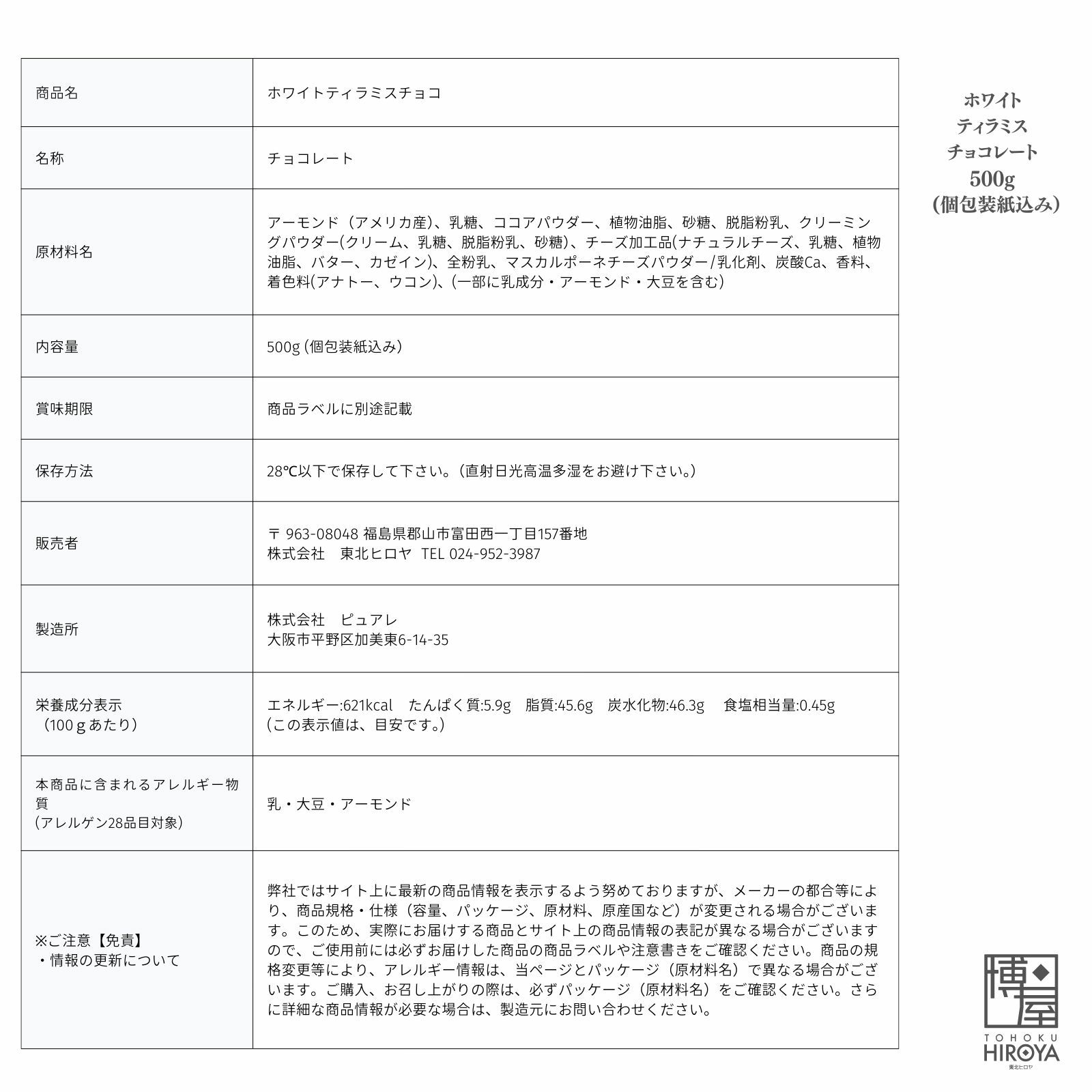 アーモンドをキャラメルコーティングし、マスカルポーネをふんだんに使ったクリームチーズで包んでココアパウダーで仕上げました。 【通常】ティラミス チョコレート ホワイト 500g x 1袋~ 国産 送料無料 チャック付き保存袋 ¥ 3,698 税込 〜 ¥ 税込 詳細を見る お気に入り登録