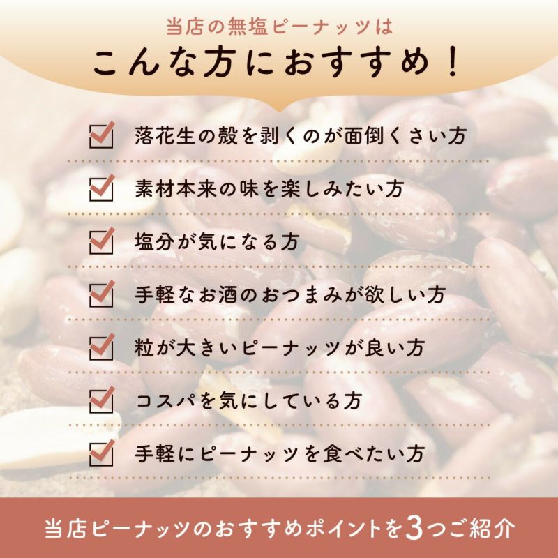厳選された大粒の生ピーナッツを、添加物や塩を一切使用せず国内で素焼き加工にしました。調味料や添加物を使用していないので、自然なピーナッツ本来の風味が味わえます。 薄皮(渋皮)付きのピーナッツはポリフェノールが豊富に含まれており、食物繊維も同時に摂れる身体に良い食材として、テレビ等でも取り上げられています。