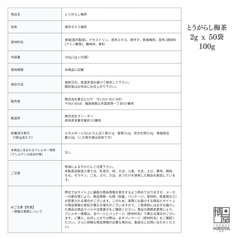 【カプサイシン効果】で体を温め、夏のクーラーや冬の寒さから守ります。ダイエット中や食欲のない時、パスタなどのお料理やお茶漬け、浅漬けなどにもおすすめです。 とうがらし梅茶 (2g x 50包) x 1袋~