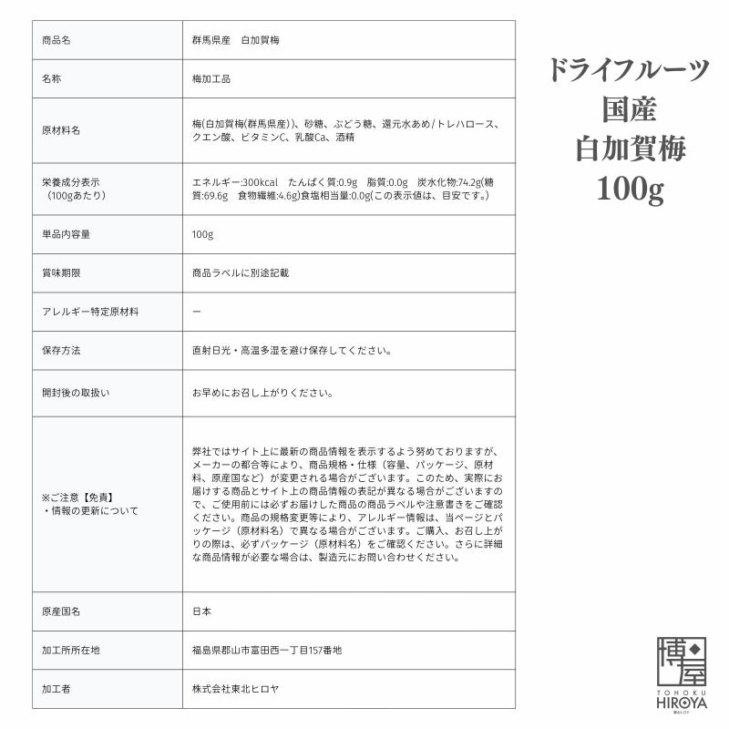 群馬県産の白加賀梅を使用したドライフルーツです。 香料・着色料・合成品保存料を使用せず、素材本来の美味しさをお楽しみ頂けます。 種を抜いて食べやすい一口サイズにしており、甘さの中にすっぱさがあるおいしいうめです。