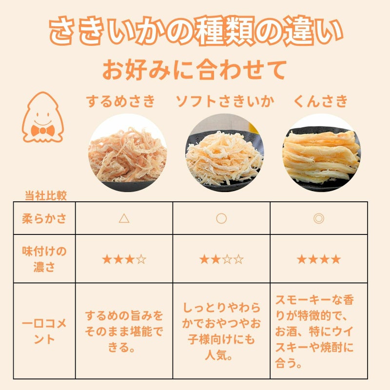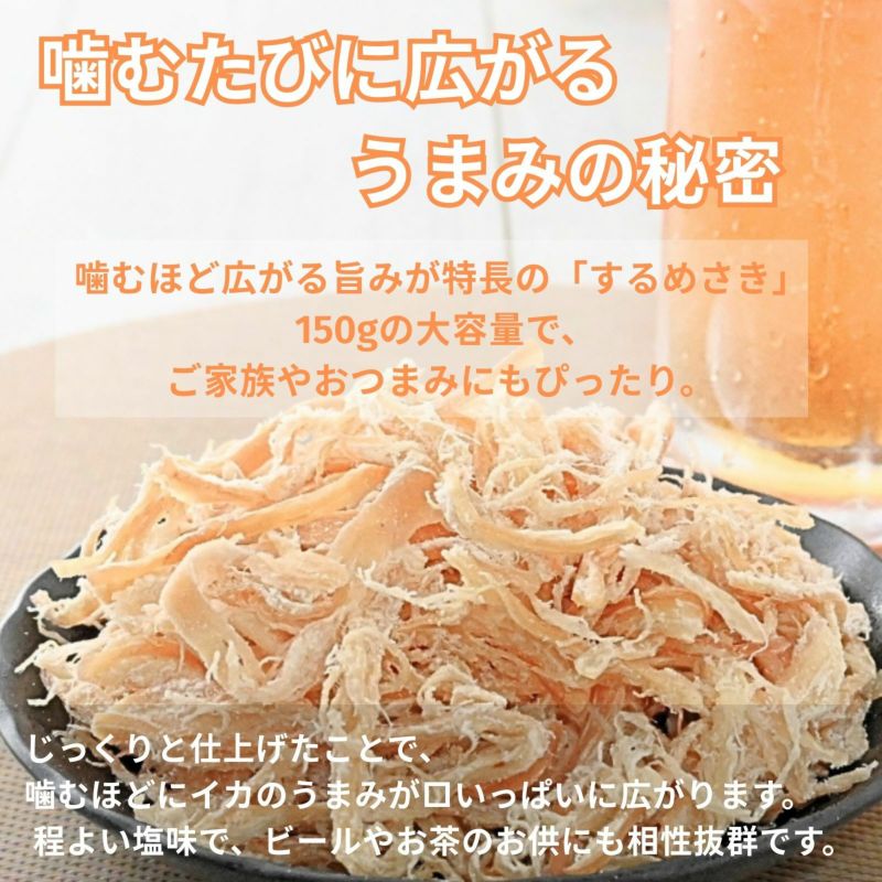 いかを使ったおつまみの一つ、するめやあたりめを炙り焼きにしてから裂いたするめさきいか。 噛めば噛むほど味が出て満腹感も得られるので、おつまみとして人気があります。 そのまま食べるだけでなく、料理の食材としても使えます。