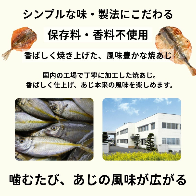 国内で製造・加工した、素材の味を大切にした素朴な味の焼あじ。 身質が締まり、程よい脂の乗りと旨みを持つ豆アジを、ほんのりと甘辛く味付けしました。 お子様のおやつや、お酒のつまみ、酒の肴としてもお手軽で便利な商品です。 ひと手間かけた風味豊かな焼きたての味をお楽しみください。