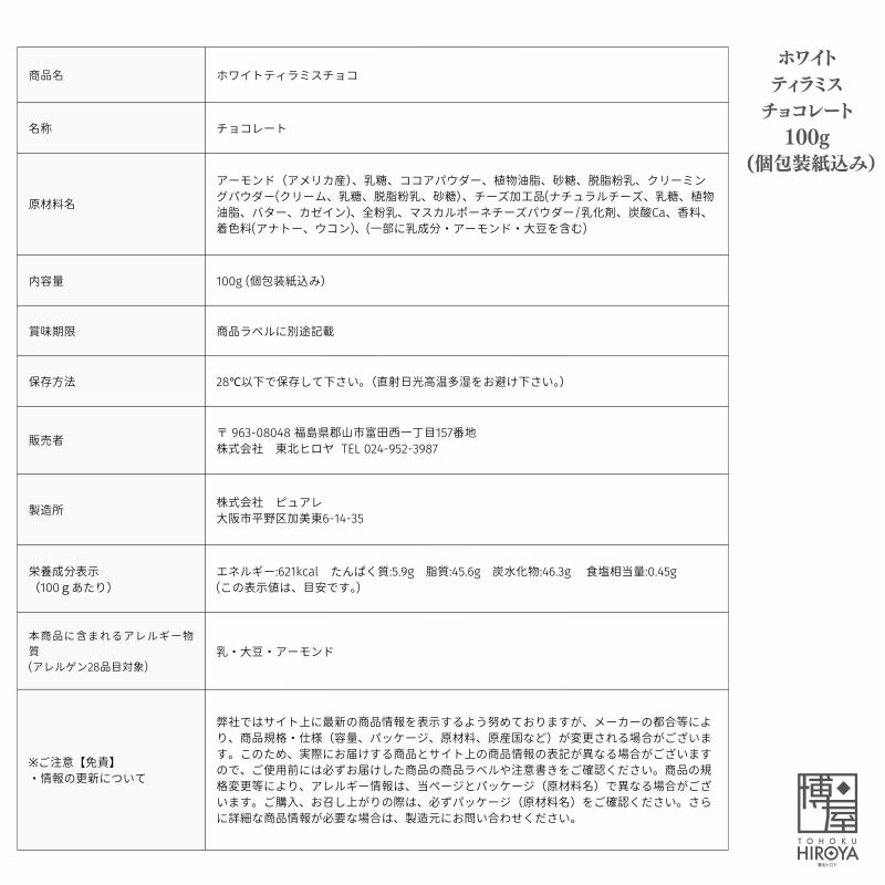 アーモンドをキャラメルコーティングし、マスカルポーネをふんだんに使ったクリームチーズで包んでココアパウダーで仕上げました。 【通常】ティラミス チョコレート ホワイト 100g x 1袋~