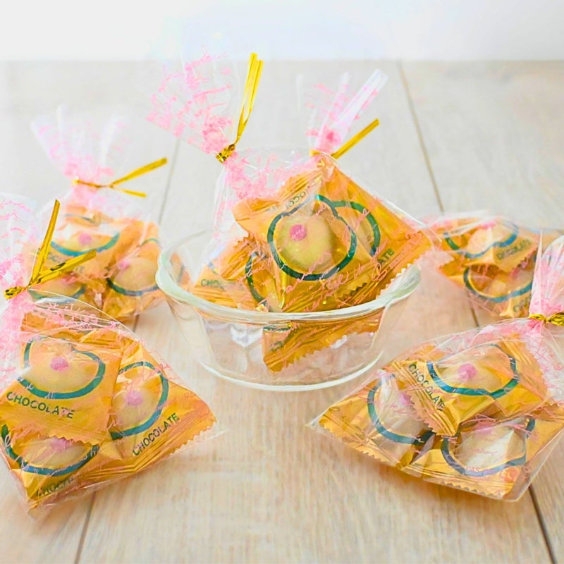 パロディーチョコレートですが、味はとてもいい感じのホワイトチョコレートです。プレゼントやパーティー等で人気があります。 プチギフト お手軽 おっぱいチョコ 6個 x 1袋~