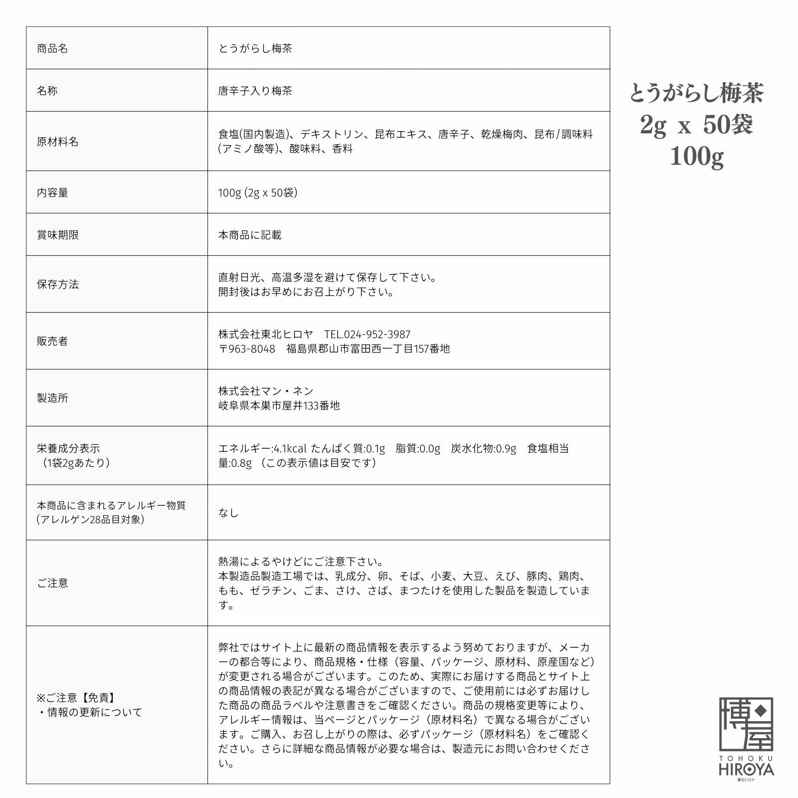 【カプサイシン効果】で体を温め、夏のクーラーや冬の寒さから守ります。ダイエット中や食欲のない時、パスタなどのお料理やお茶漬け、浅漬けなどにもおすすめです。 とうがらし梅茶 (2g x 50包) x 1袋~ 国産 送料無料 チャック付き保存袋 ¥ 1,498 税込 〜 ¥ 税込 詳細を見る お気に入り登録